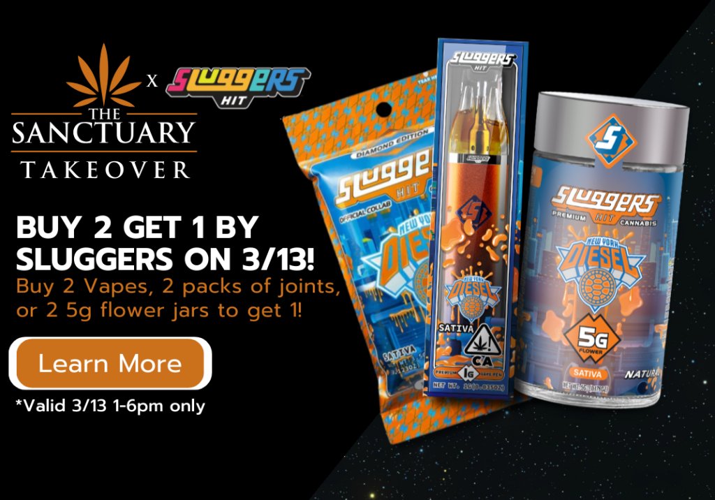 Buy 2 get ONE 1.2G Vapes, 5G flower jars and/or 5 pack joints by Sluggers!