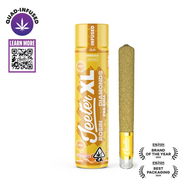 The Jeeter Quad-Infused Pre-Roll redefines infused pre-rolls by combining four premium enhancements for a superior smoking experience.. THCA diamonds provide high potency, rosin introduces a full-spectrum extract for richer depth and complexity, terpenes create a dynamic flavor profile, and kief ensures a smooth, slow burn. This purposeful infusion process delivers a more balanced and flavorful smoke. Alongside its enhanced formulation, Jeeter remains committed to sustainability, with new opaque packaging made from 25% post-consumer recycled plastic, reducing environmental impact without compromising the premium experience.