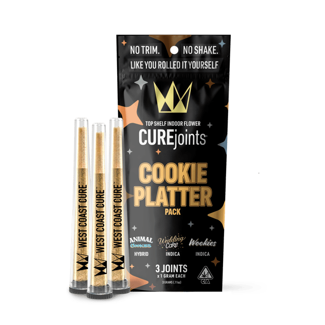 Cookie Platter CUREjoints: Animal Cookies, Wedding Cake, Wookies West Coast Cure's Cookie Platter was named after the NorCal family that brought us some of the finest cannabis strains over the past decade. A 3-Joint offering of Animal Cookies, Wedding Cake and Wookies, this curated collection of strains unites some of the best genetics the Cookie fam has to offer. Selected from some of the doughiest strains available, this 3-pack assortment of 1-gram joints is like a mixed bag of sugar-coated cookies for discerning adults. Enjoy anytime day or night, but beware you could soon find yourself a couch-locked munchie monster! The WCC Cookie Platter Pack Includes: 1 gram Animal Cookies CUREjoint – Sweet vanilla spice, GSC flavor; sweet and sour gas, baked goods aroma; Intellectually inspiring, entertaining and relaxing 1 gram Wedding Cake CUREjoint – Fiery pepper, vanilla flavor; sweet-smelling, doughy, earthy aroma; physically relaxing, socially engaging 1 gram Wookies CUREjoint – Mint, berry, petrol flavor; lavender, sweet pine, gas and citrus aroma; happy, motivating